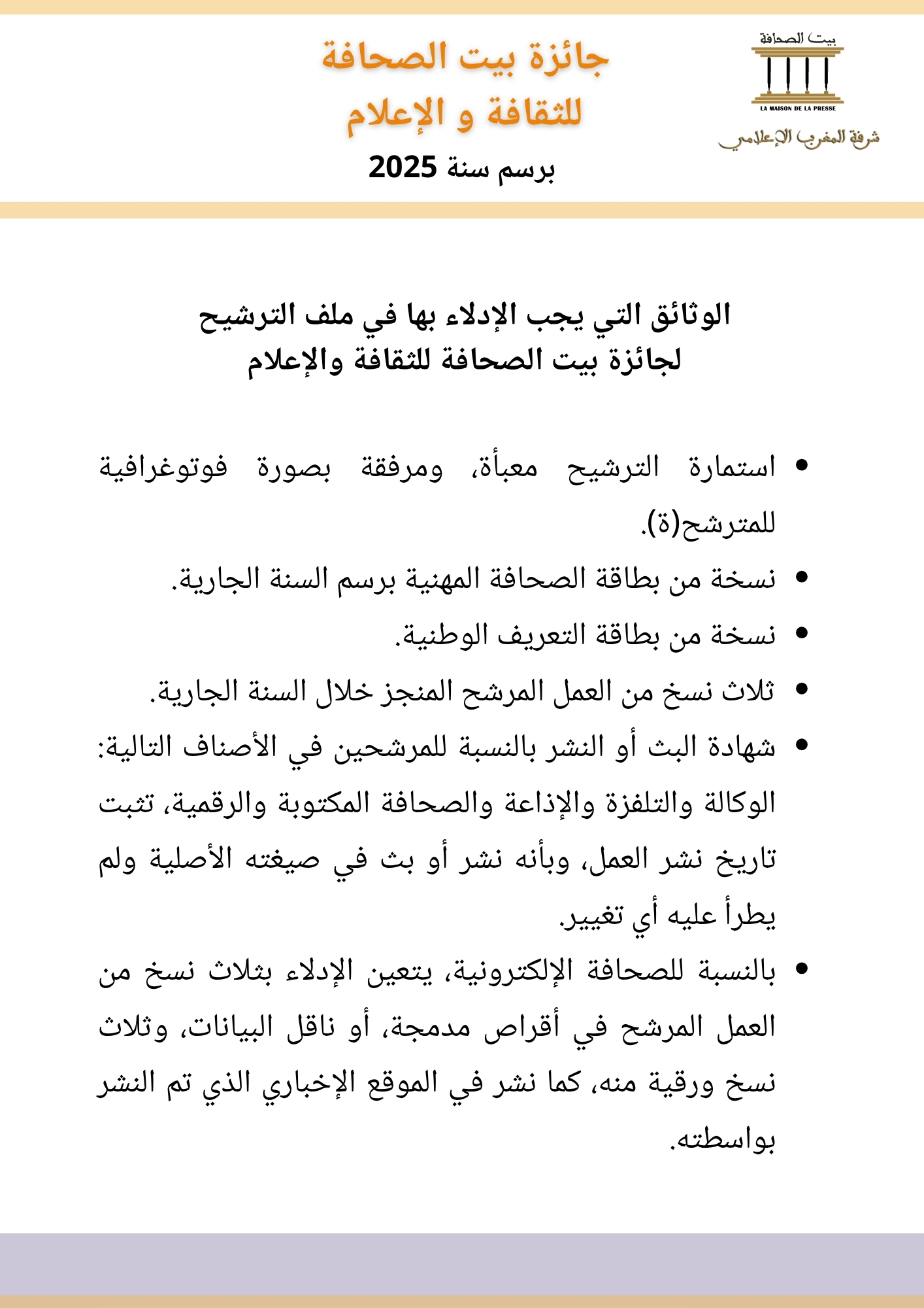 وبهذه المقاصد الاستراتيجية، التي كانت دوما كما أبدا ستكون المرجعية التحريرية والمنظومة الفكرية لمؤسسة بيت الصحافة، نعلن عن إطلاق جائزة بيت الصحافة للثقافة والإعلام، حيث نعتبرها المبادرة النموذجية لتباري المنابر الصحافية بشتى صنوفها التعبيرية والكفاءات المهنية بمختلف ألسن إبداعها، كي تترجم المكانة الاعتبارية والحاسمة لأسرة الإعلام والثقافة في تشكيل الرأي العام الوطني، وترسيخ مشروع مجتمعي حداثي وديمقراطي يتوافق ومغرب التحديات الكبرى.